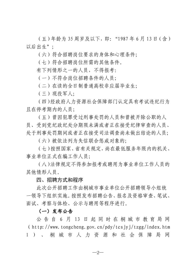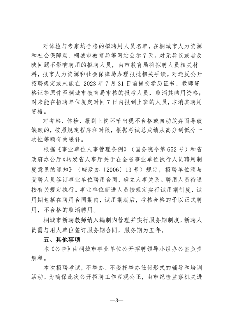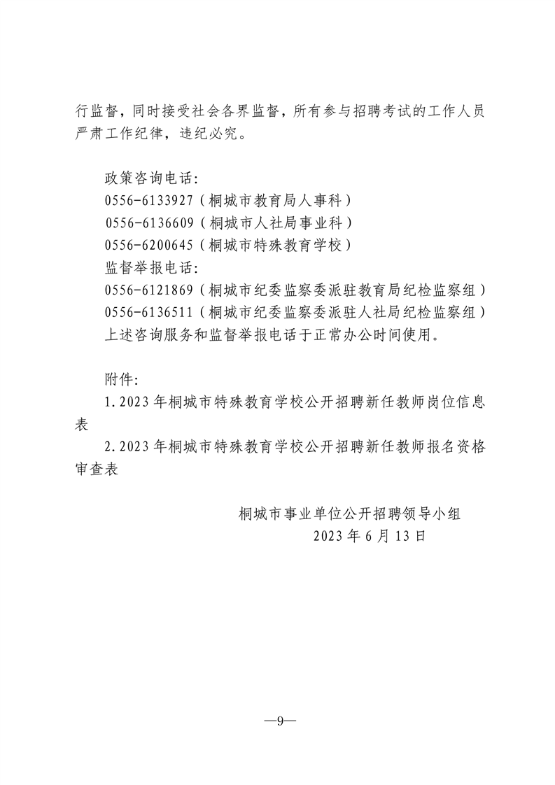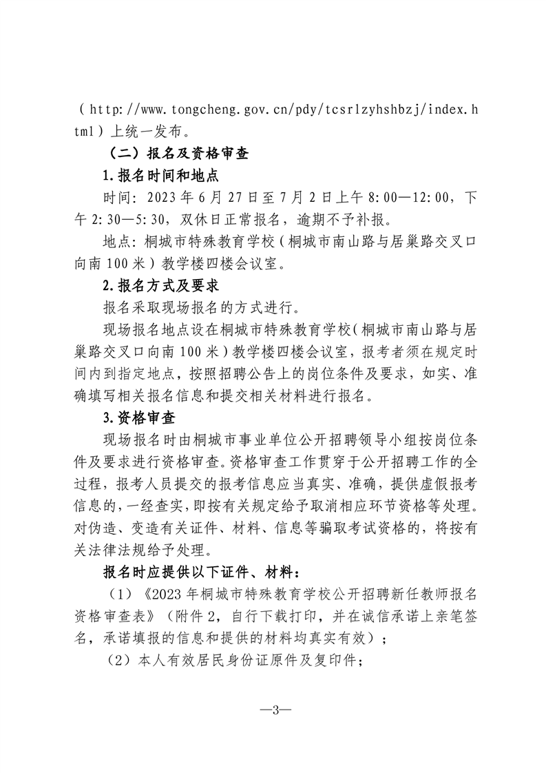 2023-06-13 17:44:37閱讀()桐城市人民政府根據(jù)《事業(yè)單位人事管理?xiàng)l例》(國(guó)務(wù)院令第652號(hào))、《安徽省事業(yè)單位公開(kāi)招聘人員暫行辦法》(皖人社發(fā)〔2010〕 78號(hào)) 、《安徽省教育廳安徽省委編辦安徽省財(cái)政廳安徽省人力資源和社會(huì)保障廳關(guān)于進(jìn)一步完善中小學(xué)教師招聘制度落實(shí)市縣中小學(xué)教師招聘主體責(zé)任的通知》(皖教秘師〔2020390號(hào))等規(guī)定和要求,現(xiàn)就2023年桐城市特殊教育學(xué)校公開(kāi)招聘新任教師工作有關(guān)事項(xiàng)公告如下: