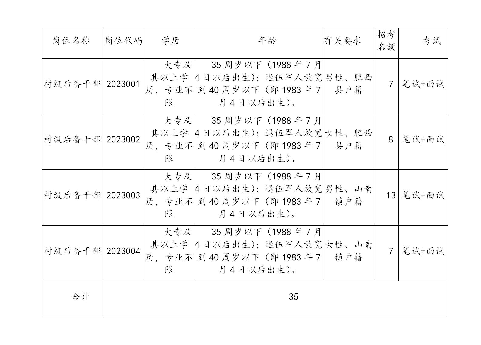 計(jì)劃招考35名村級(jí)后備干部,其中肥西縣戶籍15名;山南鎮(zhèn)戶籍20名。詳見附表。