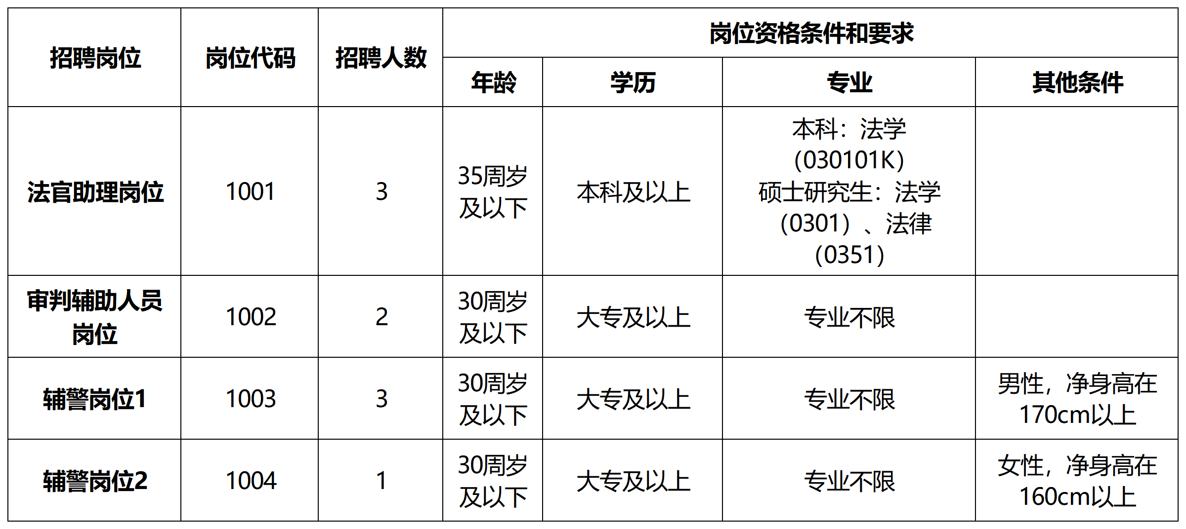 3.新聘人員試用期為1個(gè)月,試用期滿合格后簽訂勞動(dòng)合同。本次招聘的工作人員,法官助理崗位(1001崗)每人每年12萬(wàn)元左右(含社會(huì)保險(xiǎn)、公積金和工會(huì)福利等費(fèi)用);審判輔助人員崗位(1002崗)和輔警崗位1(1003崗)、輔警崗位2(1004崗)每人每年6.3萬(wàn)元左右(含社會(huì)保險(xiǎn)、公積金和工會(huì)福利等費(fèi)用)。