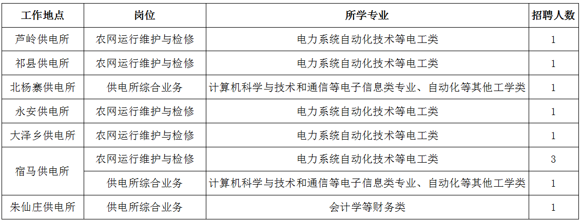 公司計劃招聘79人,派駐至鄉(xiāng)鎮(zhèn)供電所從事農電崗位工作,其中農網(wǎng)運行維護與檢修崗位需登桿作業(yè),限招男生。
