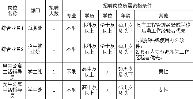 安徽省特殊教育中專學(xué)校(以下簡稱省特教中專學(xué)校)因發(fā)展需要,現(xiàn)面向社會公開招聘4名編制外工作人員。現(xiàn)就有關(guān)事項公告如下: