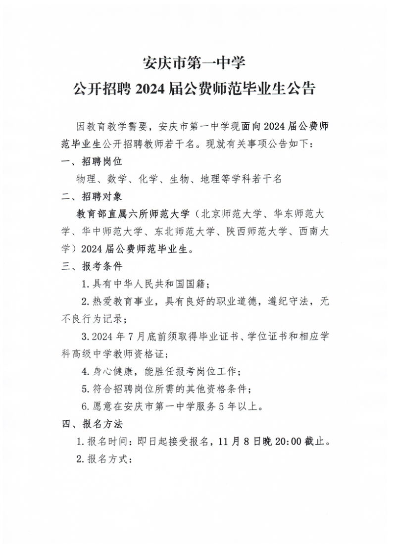 2023年安慶市第一中學公開招聘2024屆公費師范畢業(yè)生公告