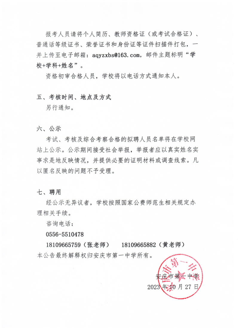 6.愿意在安慶市第一中學服務5年以上。