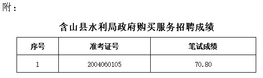 2020-04-20 18:09:15閱讀()含山縣人民政府因部分考生放棄資格,根據(jù)《縣水利局公開(kāi)招聘政府購(gòu)買(mǎi)服務(wù)工作人員公告》,按照筆試成績(jī)從高到低順序,遞補(bǔ)以下考生,公示期限3天,自2020年4月14日至2020年4月16日。