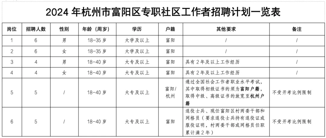 本次計(jì)劃面向社會(huì)公開(kāi)招聘專職社區(qū)工作者30人。具體招聘崗位、人數(shù)和報(bào)考條件等詳見(jiàn)《2024年杭州市富陽(yáng)區(qū)專職社區(qū)工作者招聘計(jì)劃一覽表》。