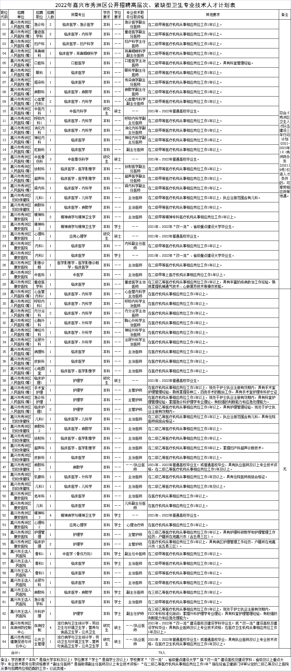 2022年嘉興市秀洲區(qū)公開招聘高層次、緊缺型衛(wèi)生專業(yè)技術(shù)人才79名。具體的招聘單位、職位、人數(shù)和資格條件詳見《2022年嘉興市秀洲區(qū)公開招聘高層次、緊缺型衛(wèi)生專業(yè)技術(shù)人才計劃表》(附件1,下稱《計劃表》)。