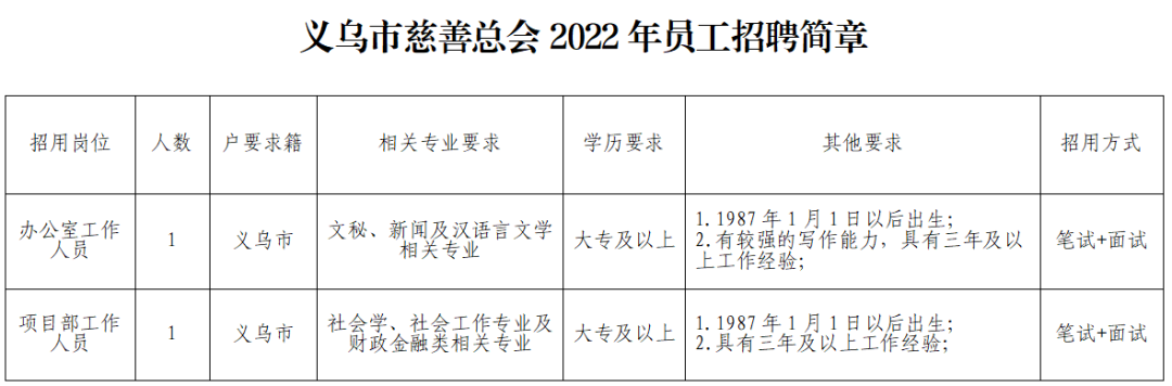 (1)應(yīng)聘人員須詳實(shí)填寫(xiě)《義烏市慈善總會(huì)2022年員工招聘應(yīng)聘報(bào)名表》(附件2);